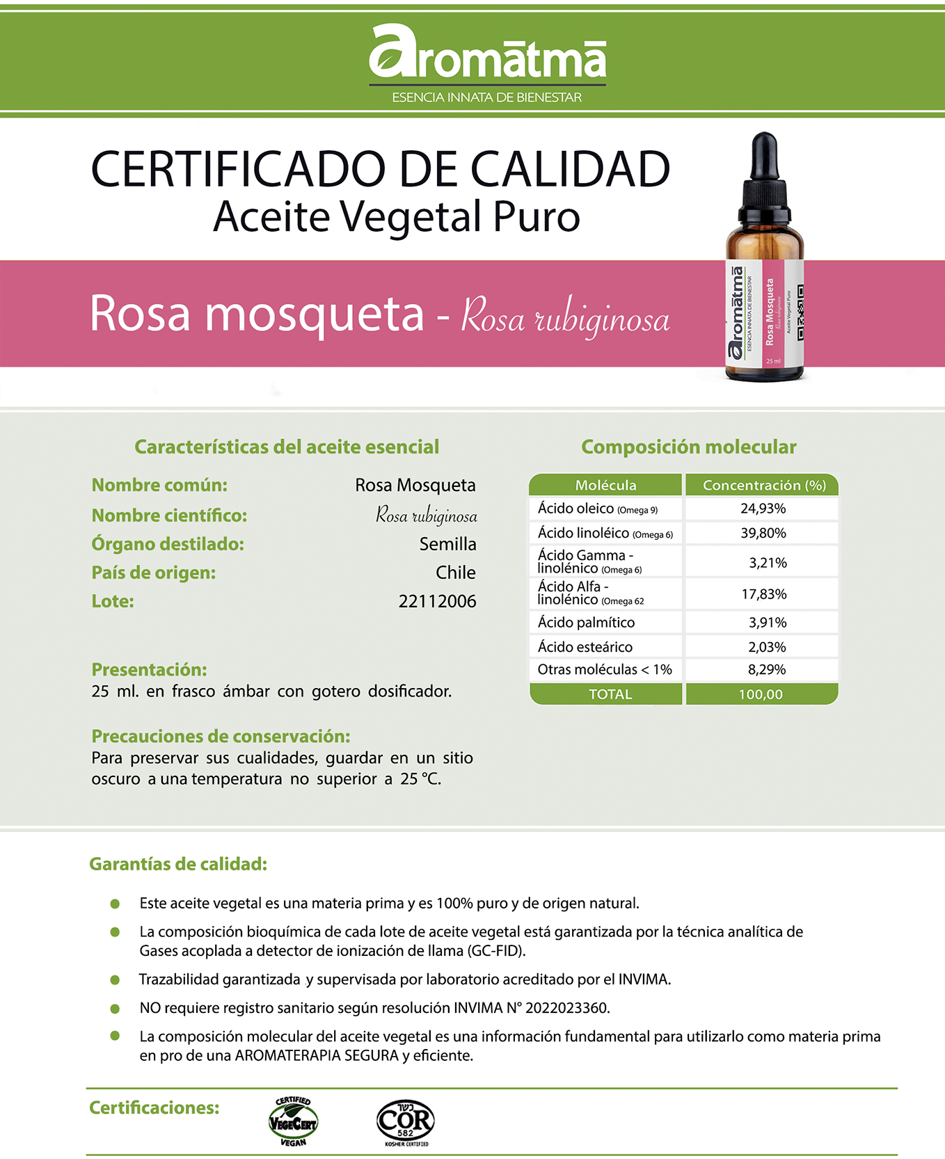 Garantía de Calidad: Los aceites esenciales cuentan con una certificación de no obligatoriedad de Registro Sanitario otorgado por el INVIMA según resolución 2021035758.